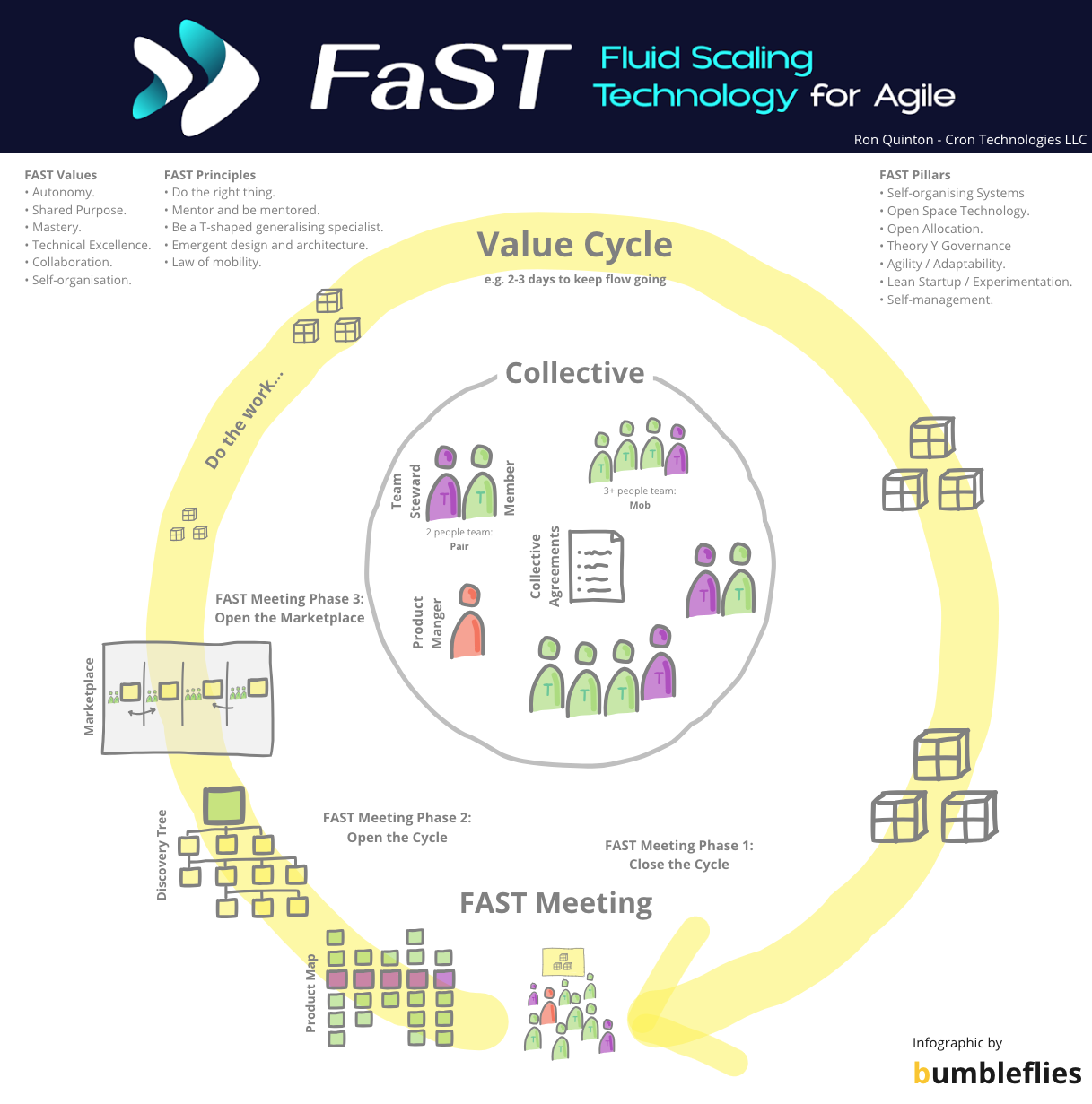FaST-Agile ist ein Beispiel für das Einbetten und Zusammenspiel von Open Space in einen speziellen Kontext. Die Fluid-Scaling-Technology kombiniert Open Space Technology und Open Allocation zu einer leichtgewichtigen, einfach zu verstehenden und einfach zu beherrschenden, skalierbaren Methode für die Organisation von Menschen rund um Arbeit.
